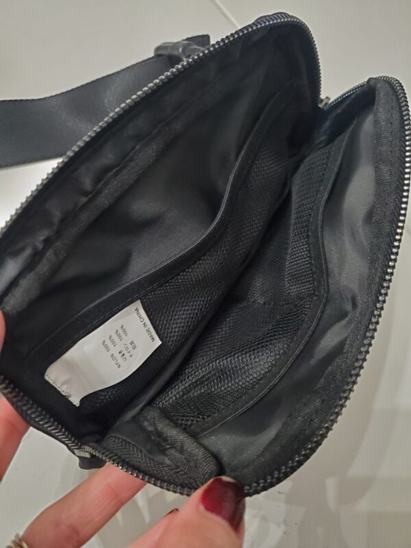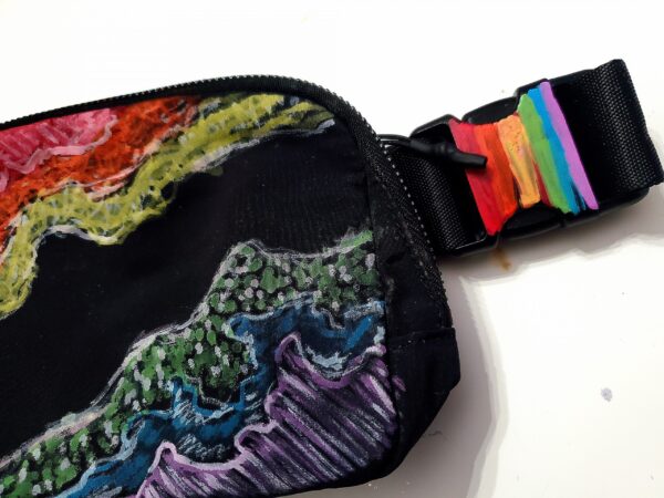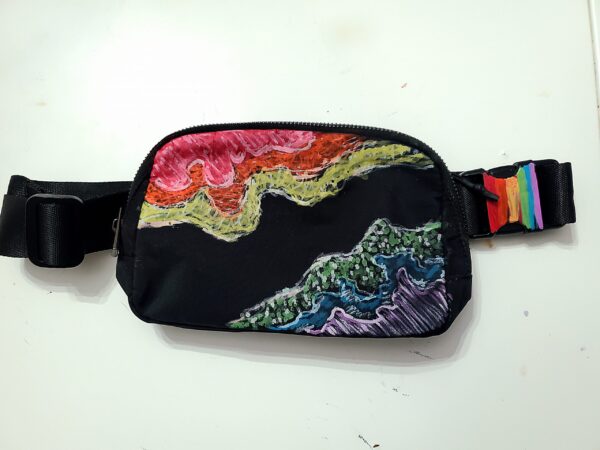 Fun and functional hand painted cross body bag. Water Resistant, Adjustable Strap, 1 Main Compartment, 3 Mesh Slots, 1 Back Zipper Pocket, Black