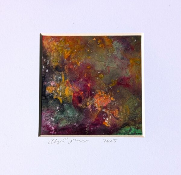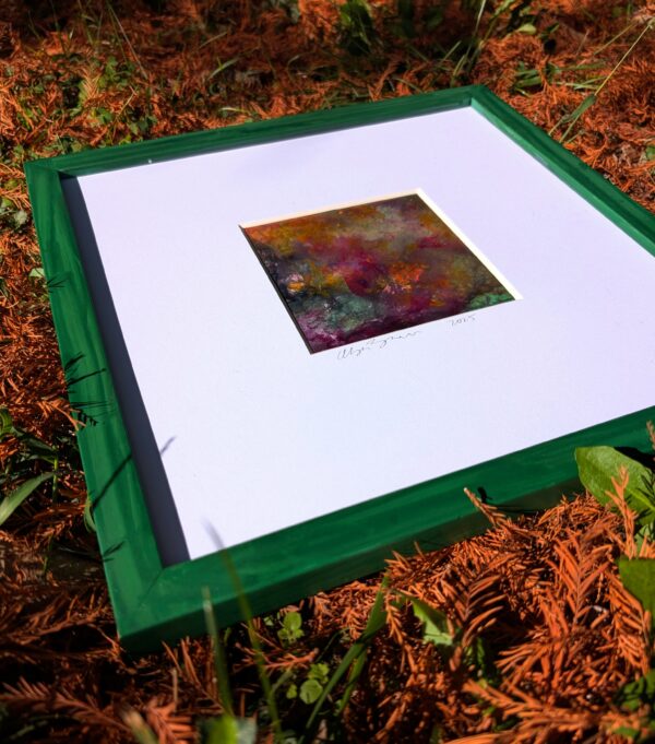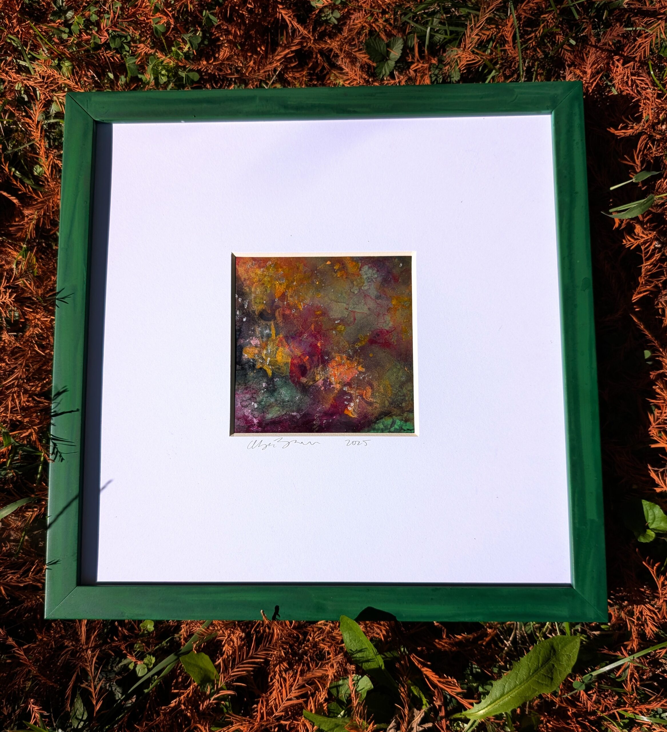 Picked this palette straight from the forest! Mixed Media on yupo paper. Framed in a stunning thrifted forest green 12″ wooden frame, 4″X4″ white matting.